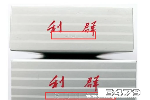 假烟:钢印钢印数字或者字母的位置在“利群”下方,同时字体大小一致,字体深浅比较一致,字体清晰可变,且字体间距比较大,并没有紧挨着。