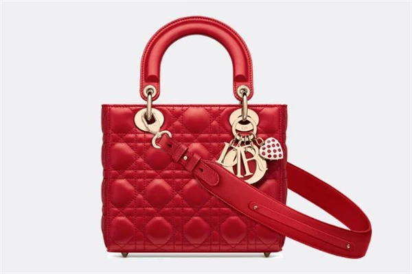 2时髦而柔美,经久不衰而不失现代时尚。采用红色羊皮革精心制作,标志性的经典藤格纹针脚包覆,精良的缝制工艺显露无遗。红色珐琅心形吊饰搭配白色波点,与标志性的同色调“D.I.O.R.”吊饰一起装饰经典的版型。可在肩带上加入浅金色的符号徽章,点缀日常或晚宴造型,彰显鲜明个性。