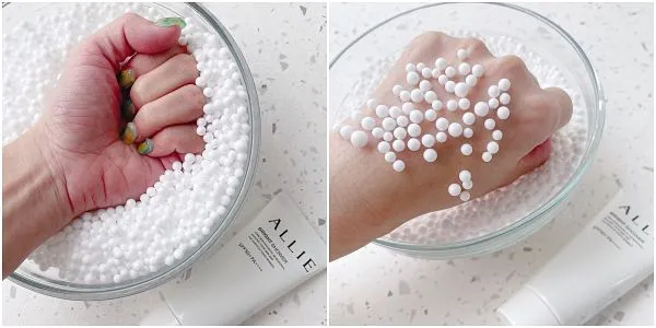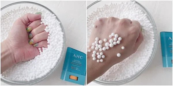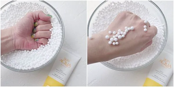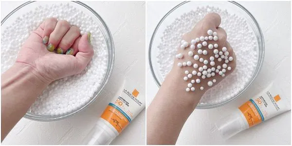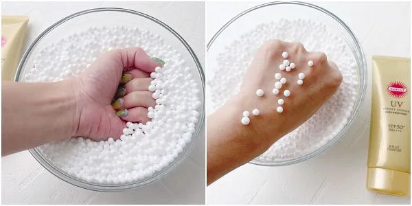 接着要来测试黏腻度,测试方式为在手背上挤出珍珠般大小的防晒品,均匀推开后将手背放入装满保丽龙球的碗中用力按压一下,观察手背伸出后保丽龙球的黏贴状态,越多代表越黏腻;越少则代表越清爽!