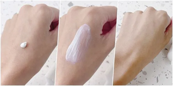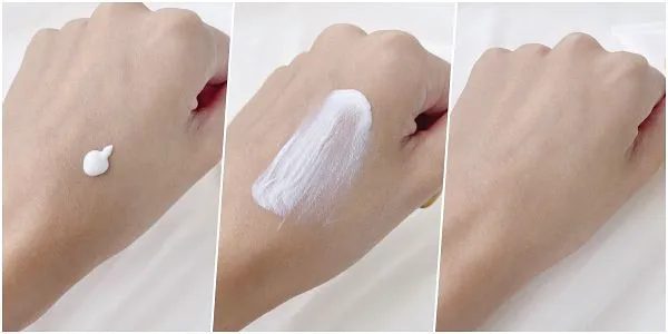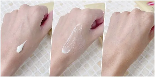 为乳状质地,非常好延展推开,能快速均匀涂抹,且涂抹完有肌肤变得更明亮有光泽,完全不会有泛白感。