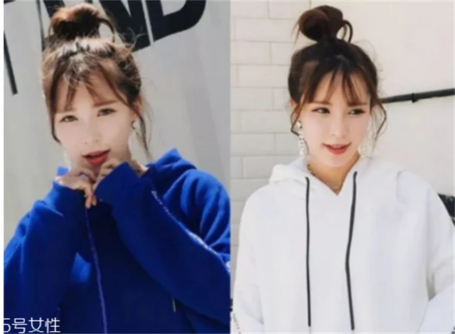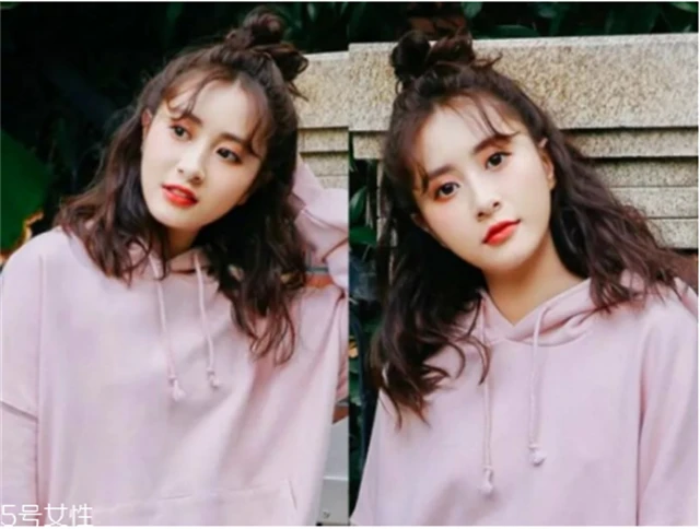 一络一络稀疏的刘海,呈八字的形状,轻盈无规则地趴在额头上,和脸颊两侧自然垂下的散落发丝修饰出完美的脸型,很显女生的优雅气质,头上再扎个清新自然的丸子头,满满的青春活力,非常减龄。