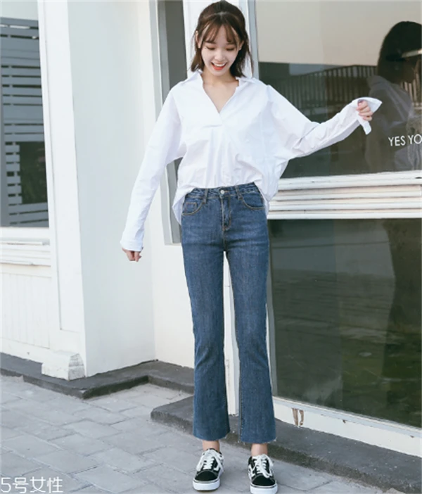 1.首先是这款裤脚带有微喇的高腰牛仔裤。高腰的牛仔裤可以显得腿特别的长,而且这款牛仔裤的面料也是非常的有弹性,穿着特别舒服,不会有很勒的感觉,提臀效果也是一级棒。