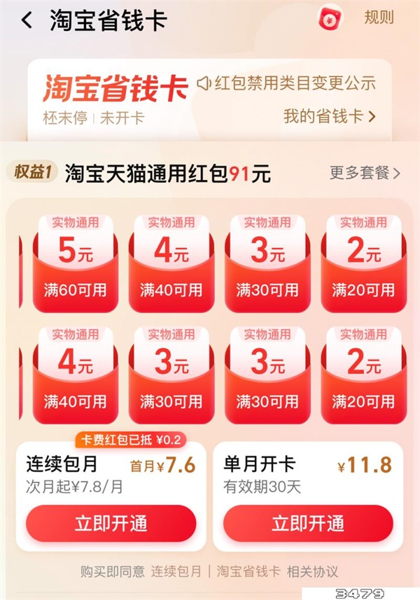 3、淘宝省钱卡是给淘宝用户的福利,目前只对邀请用户开放。若是找不到省钱卡入口,则是未受到邀请,请耐心等待后续开放。