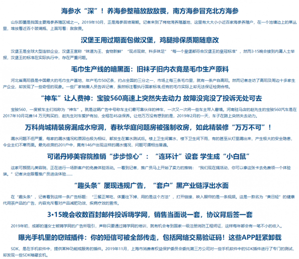 1、截止到发稿日期,小编并没有在以往的315晚会的晚会中有看到东施帛神梳的相关内容。因此可以说目前315并没有打假东施帛神梳。2020年的315晚会的内容如下: