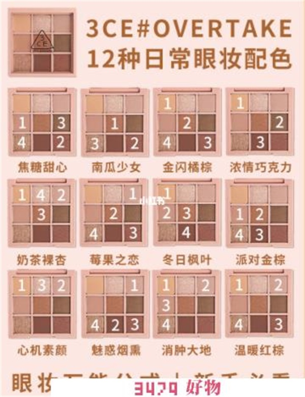 3ce的花盘一共有九种不同的眼影,这些不同的眼影能够组合出的画法也是会非常的多。不同的组合所呈现出来的效果也是不同的,大家一般都是根据自己的形象来进行画法的选择,接下来给大家介绍比较常见的九种画法。