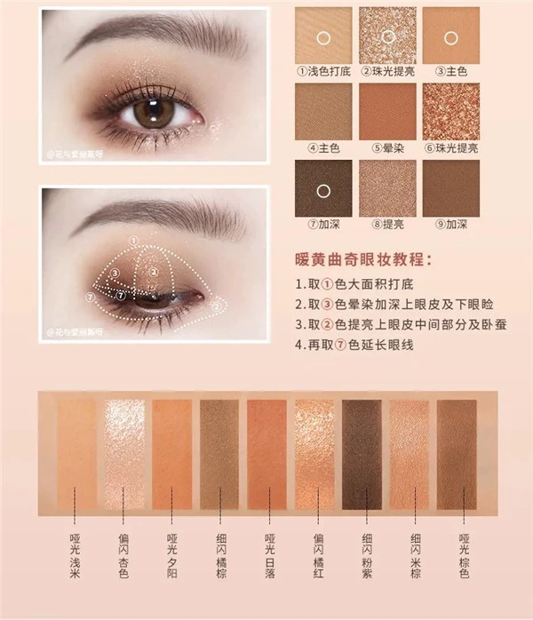 温柔奶油橘咖色调,定格盎然元气双眸。低饱和度的暖棕色系,带一点高级的灰调,温柔又耐看。哑光、细闪、亮片一应俱全,百搭又实用,日常消肿效果简直不要太棒!粉质细腻好晕染,显色度和延展力拿捏得刚刚好,上眼层层叠加也非常清透,新手上妆毫无压力‼️