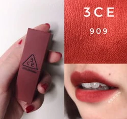 3、3ce色号909红棕色,这个色号的口红有一点点偏暗黑系,属于雾面哑光质地的,适合黄皮来使用,无论是薄涂还是厚涂的颜色都是偏土棕颜色的,有点像砖红色,比较适合秋冬季使用,唯一的缺点在于比较干。