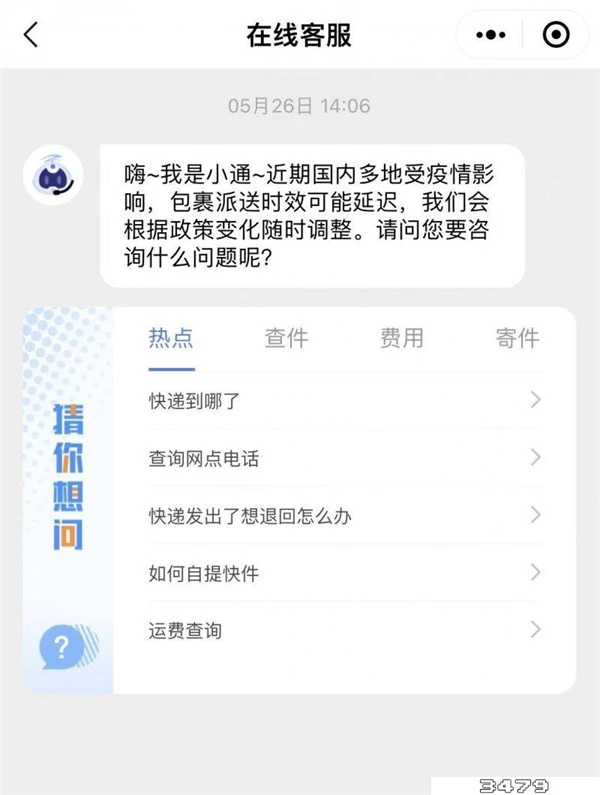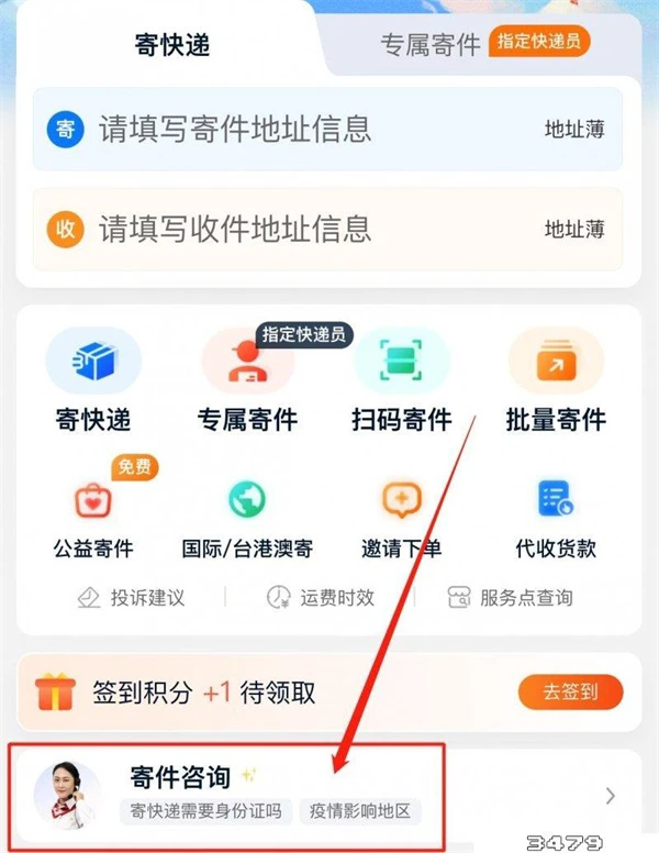 2、进入小程序后点击底部“寄件咨询”,即可进入客服页面;