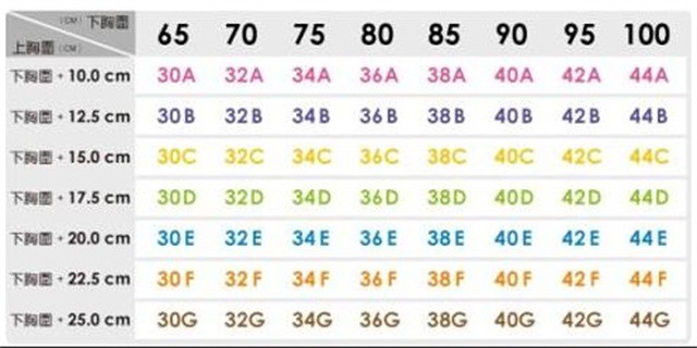 假设一位女性,胸围85cm,下胸围70cm,那么罩杯尺寸就是85cm-70cm=15cm。罩杯一般用a、b、c等大写英文字母表示,每2.5cm为一级,aa最小为7.5cm,a为10cm,b是12.5cm,c是15cm,d是17.5cm,e是20cm,再往上就算是特种尺寸了(详见尺码对照表)。像上例说的那位女性,胸围85cm,下胸围70cm,罩杯尺寸为15cm,就是c。于是,她适合穿的胸罩型号就为70c。只要是符合国际胸罩标识标准的产品,都是用这样的方法来区分型号的。