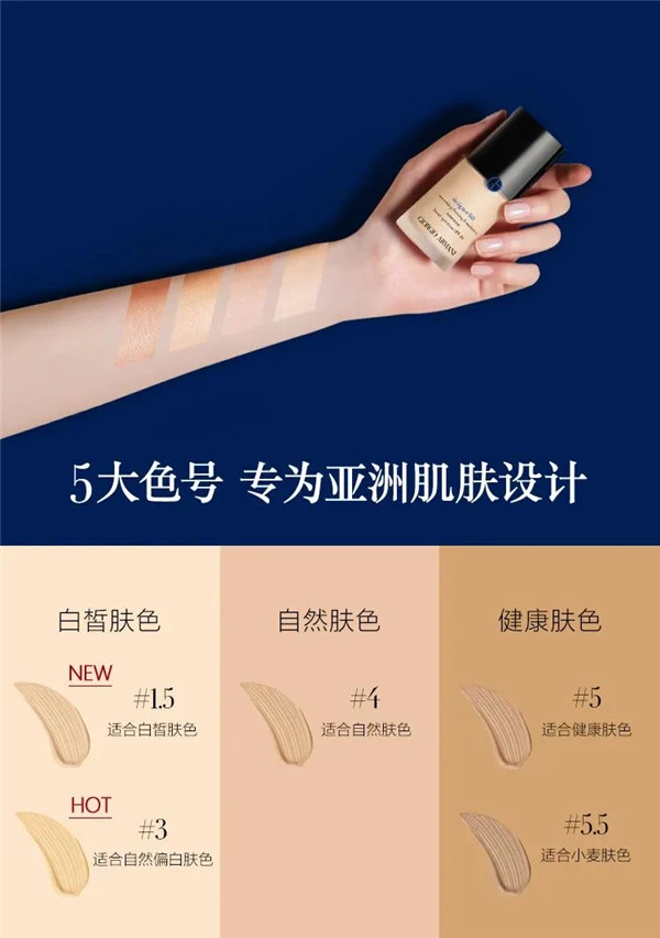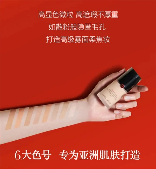 阿玛尼「大师」粉底液:配方诞生十年,陪伴阿玛尼走过每一季;简单,卓效,不出错,让你即刻告别倦容。大师底妆,大师妆感,底妆不见瑕疵,肌肤呈现丝缎光泽 每一刻都完美无瑕。突破性底妆理念,普鲁士蓝调光微粒,即刻匀净肤色,立现通透光感。粉质细腻滋润,超微研粉科技,粉质细腻,轻薄不假面;特别护肤基底,滋润不卡粉。