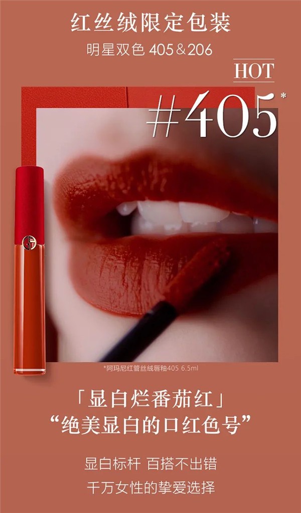 浓郁出色,阿玛尼重新定义哑光妆效,调整配方中的色素含量,优化了色素微粒与精油的比例,挚爱哑光唇膏蕴含更高的色素含量,高饱和度的色素微粒为你的唇部带来非凡哑光的浓郁色彩。丝滑润泽,全新革新性配方,调整了精油浓度,加入润肤剂、酯类精油和霍霍巴油成分,令阿玛尼挚爱哑光唇膏丝滑润泽。同时加入了透明绒亮啫喱,能为唇部扩散光线,带来双唇柔焦效果,营造高饱和唇色与立体感的非凡哑光唇妆,时刻保持诱人魅力。
