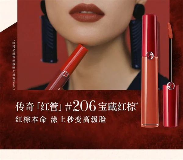 被视为女人会一见钟情的阿玛尼NO.1*唇萃「阿玛尼奢华丝绒订制唇萃」以独家「4D丝绒雾光球体」 随光线自然折射色泽,创新「丝绒柔滑凝胶」抚平唇纹高效润泽,打造丝绒雾光,遇见当下随时爱上这就是它的魅力,2022「阿玛尼奢华丝绒订制唇萃-七夕限定版」将3款经典热卖色,#206红棕玫瑰这最被男人激赏的甜美焦糖暖红棕,不彰显的甜蜜一如爱情中最令人回味的暧昧期,#405绯红礼帽就是你俩的爱情,红的火热又经典,#415枫红玫瑰则是浪漫的秋意枫叶红,象征着恋爱中不可缺少的小确幸,GIORGIO ARMAN为期限定的人气色选,以红线缠绕系着爱,为你找到命中注定!