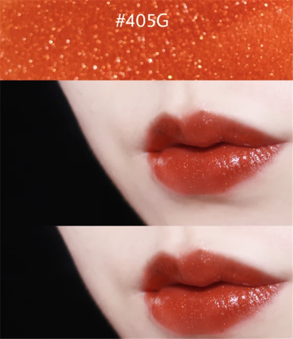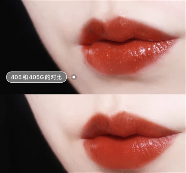 405是烂番茄色,适合黄皮肤。405g这是圣诞限量款,里面加了金闪,在质地上有一种丝绒的感觉,颜色要比405偏橘。