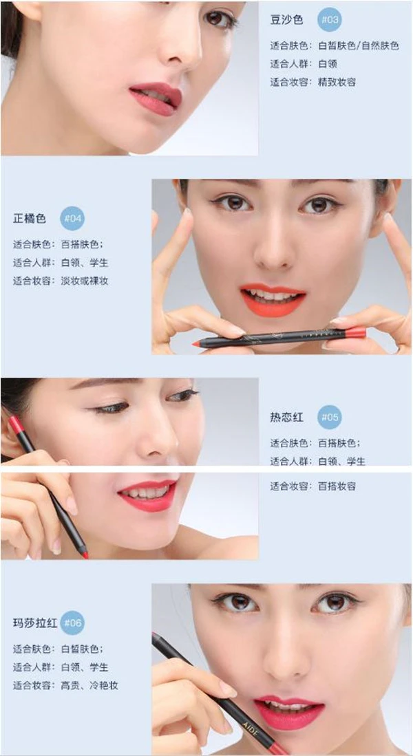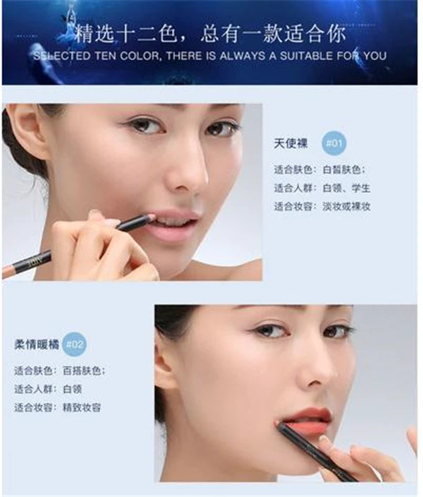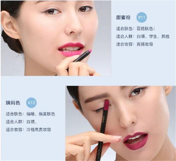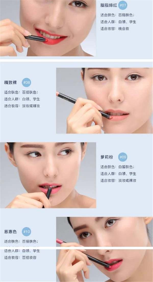 使用方法:以唇线笔描绘唇型,再搭配任何唇彩系列,可创造完美精致唇妆;或以唇线笔涂满整个唇部,再以唇刷均匀晕染,创造雾面妆效。