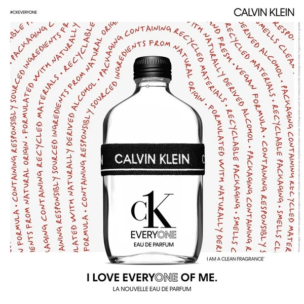 Calvin Klein品牌的CK ONE系列中的最新款香水于2022年1月上市,这是向CK One香水永恒精神的致敬。正如品牌称,CK EVERYONE EAU DE PARFUM关心环境,并采用纯素配方,由符合道德标准的天然成分制成。酒精是天然来源的。玻璃瓶和外包装均由回收材料制成。透明玻璃包含10%的消费后回收材料,包装纸盒包含30%的消费后回收材料。这两种材料都可以再次回收。