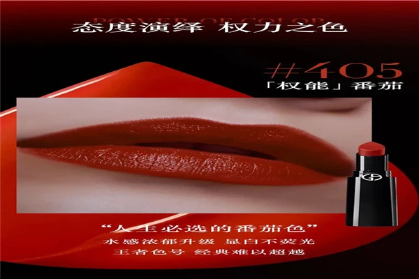 LIP POWER「权力」唇膏深蕴阿玛尼美妆精髓,融合彩妆精研技术,展现品牌匠心独运的美妆艺术。独特持色「UP」科技,融合不可兼容的四种成分,突破性添加慢挥发性油膜,超长锁色锁水,持久持色令双唇披上护唇战衣;同时兼得唇膜级养护力,润泽饱满,隐匿唇纹,打造阿玛尼首支会成膜唇膏。