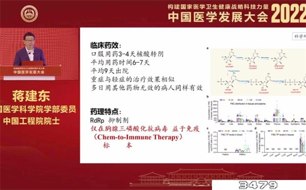 蒋建东院士根据此前20人临床数据对阿兹夫定的临床药效进行说明,称患者口服用药3-4天核酸转阴,平均用药时间6-7天,平均9天出院。并且,阿兹夫定与其他新冠药物不同,其对多日用其他药物无效的病人同样有效,并且对重症与轻症患者的治疗效果相似。