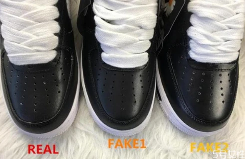 鞋头皮质和鞋带对比,REAL鞋头皮质黑得有复古的感觉,皮质不太反光,FAKE皮质反光明显,REAL鞋头透气孔打的很深,旁边没有顿挫的感觉,REAL鞋带颜色偏奶白色,FAKE鞋带大多数偏白。