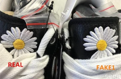 鞋舌小雏菊对比,REAL鞋舌上的小雏菊刺绣很立体,花瓣和花都立体,花得颜色更黄,FAKE鞋舌花得颜色没有REAL黄,花瓣刺绣也没有REAL立体。