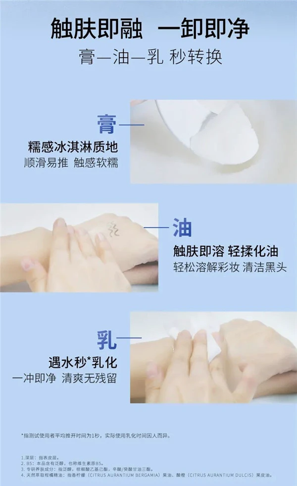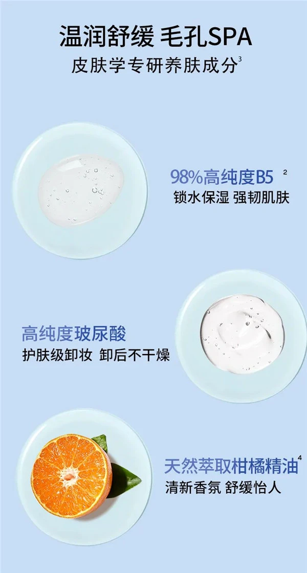 AHC专研B5玻尿酸糯感卸妆膏蕴含98%高纯度B5及高纯度玻尿酸两大成分,卸下肌肤负担的同时温润呵护每一寸肌肤,让肌肤卸后不紧绷;另外添加萃取柑橘精油,为消费者带来SPA般护肤感受,在清新怡人的柑橘味香氛中静享片刻愉悦时光,开启一场卸妆新体验。