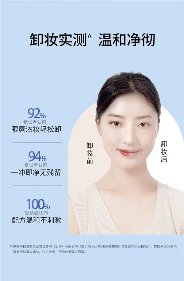 消费者卸妆实测表明,91.9%的受试者认同眼唇浓妆可以轻松卸除,93.5%的受试者认同一冲即净无残留,100%的受试者认同配方温和不刺激。