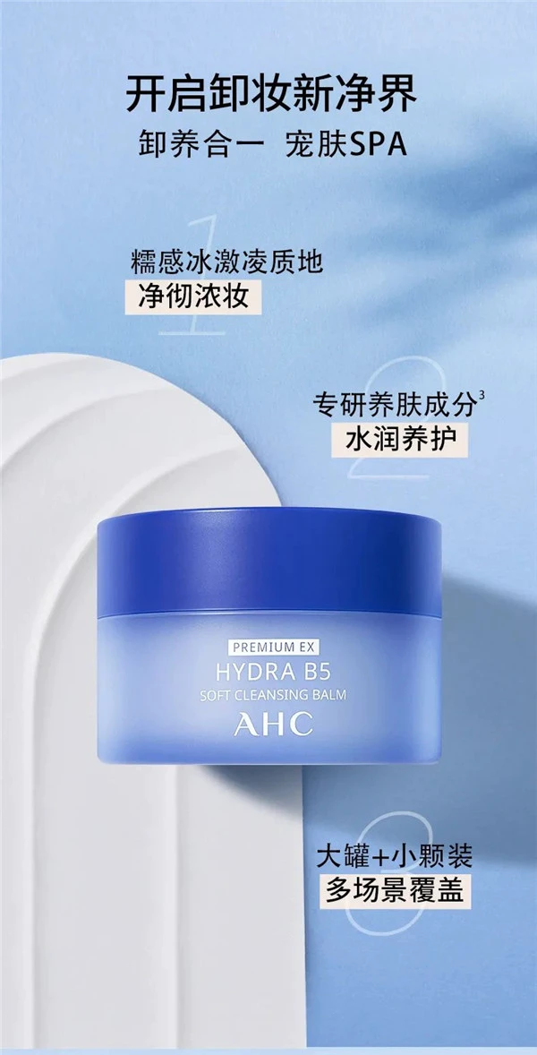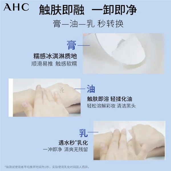 AHC专研B5玻尿酸糯感卸妆膏,采用独特糯感冰淇淋质地,顺滑易推,无需用力擦拭,轻轻推开便化为油状;减少摩擦不伤肤,触水快速乳化,冲洗后无残留。膏-油-乳瞬间转换的冰淇淋质地,可以降低手掌与肌肤的摩擦及油分残留,轻松溶解彩妆,卸后肌肤水润不易紧绷,达到温和净彻卸妆效果的同时仍能呵护肌肤。
