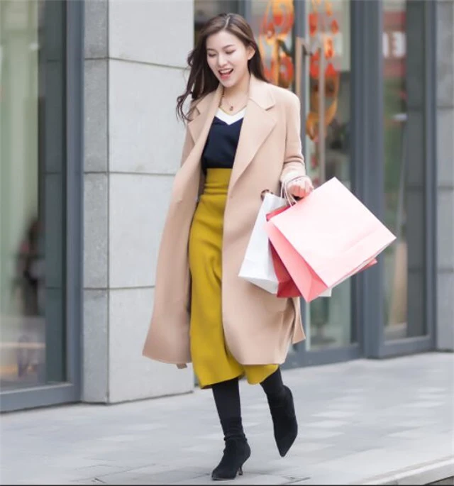 4、冬天不想穿秋裤,可以试一试大衣搭配长裙。大衣搭配长裙,记得拉高腰线,裙子的长度也是最好不超过小腿肚。露出脚踝或小腿能很好的修饰身高比例。