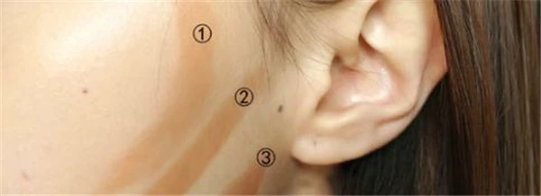 2、第一步修饰正面颧骨过突位置,第二步修饰颧骨往下巴两角处突出脸部线条,切勿过长。第三步从鬓角下方往下巴处做阴影。圈圈位置用高光棒提亮看起来会超级有光泽感,眼下只要在遮瑕部分延长和最后收尾使用PK07就可以达到提亮和填充泪沟效果。