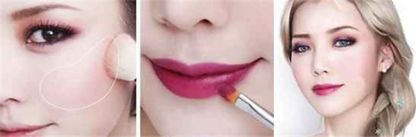 STEP28:用腮红刷蘸取粉红色腮红刷沿着苹果肌自然向上刷。 STEP29:用唇刷蘸取紫色唇膏涂抹全唇,然后勾勒出唇线,整个妆容就完成了。