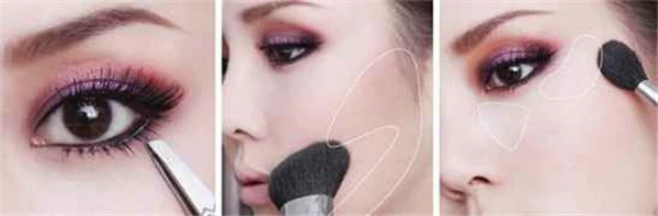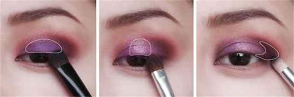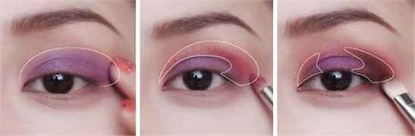 STEP10:用手指蘸取紫色眼影涂在双眼皮褶皱内,然后朝上方晕染开。睁眼时能看到3mm宽度为佳。 STEP11:用眼影刷蘸取玫红色眼影涂在眼窝轮廓处。 STEP12:用眼影刷蘸取深酒红色眼影涂在上眼睑眼头及眼尾处,打造立体感。
