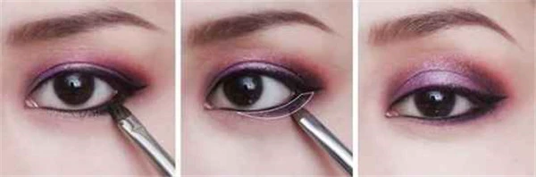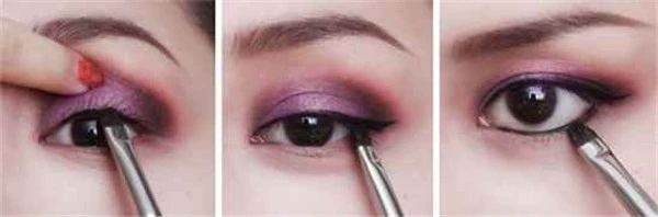 STEP13:用眼影刷蘸取紫色眼影涂在上眼睑中间位置处,让紫色更加明显。 STEP14:用眼影刷蘸取带珠光的粉红色眼影涂在上眼睑眼球凸起处,加强闪亮度。 STEP15:用眼影刷蘸取黑色眼影涂在上眼睑眼尾处,强化阴影效果。