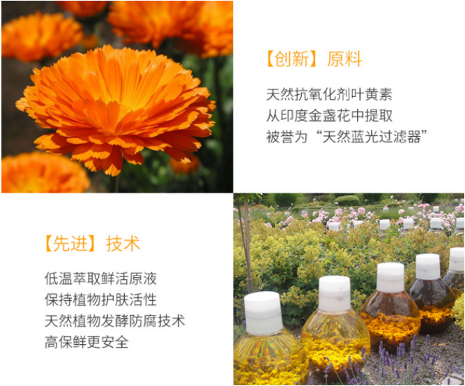为此,来自德国有机护肤行业先驱的安娜柏林,多年来一直追寻能够有效抵抗蓝光的物质,终于在印度金盏花中发现一种特殊的叶黄素,它的化学结构可以高效吸收生活中的蓝光,配以专业的萃取保鲜技术应用到护肤品上,成就了“天然的蓝光过滤器”。