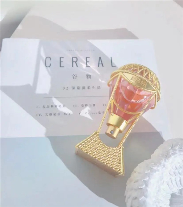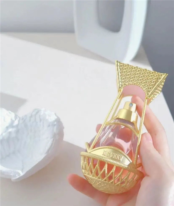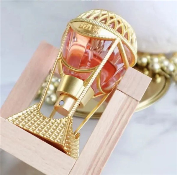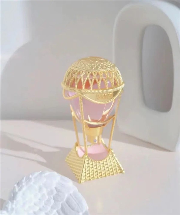 瓶身十分依旧华丽而特别,是铁艺制成的金色麻绳编制的热气球,浅粉色的玻璃瓶为气球球身,金色的仿麻绳部分细巧而精致