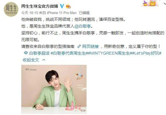 他突破自我,挑战不同领域;他玩转潮流,演绎百变型格,他,是周生生珠宝品牌代言人白敬亭!坚持初心,前行不止,周生生携手白敬亭,灵感一触即发,一起创造时尚搭配的无限可能。