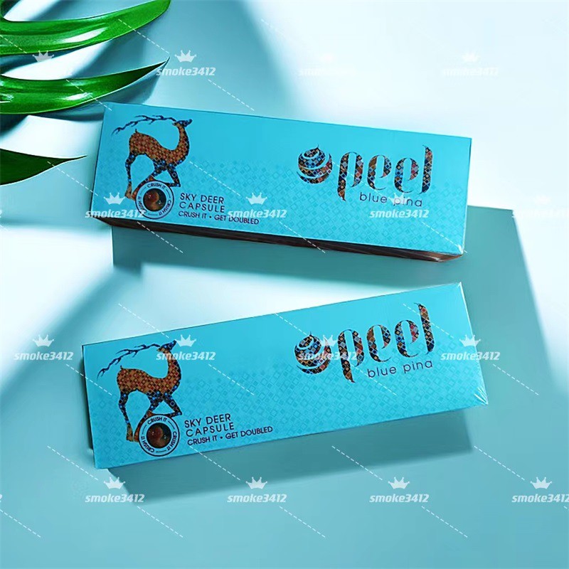 这款百乐peel凤梨爆珠香烟的一个风格整体都是以小清新为主要的一个风格,非常年轻的一个颜色,浅蓝色,这个蓝色很像Tiffany蓝的一个颜色,副色调和图案面是有一些小纹的,给这一款烟盒带上一个点缀的一个效果,迷彩的梅花鹿是凤梨味的一个标识图案,爆珠在照灯光下面也是闪闪发光的,摸上去有立体感,还有百乐的英文标识,和迷彩鹿的花纹一致。