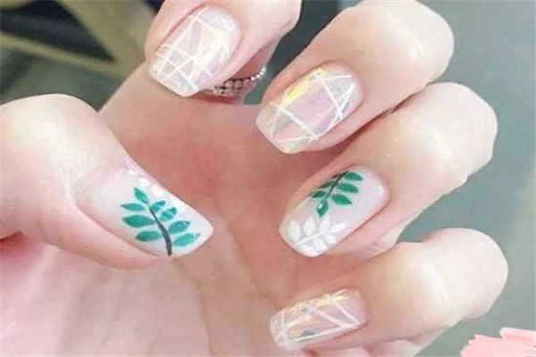 第三款也是非常清新的一款,采用了白色甲油上面勾画了叶子,同时还配合了镭射美甲,既清新但是又很有特色的一款。