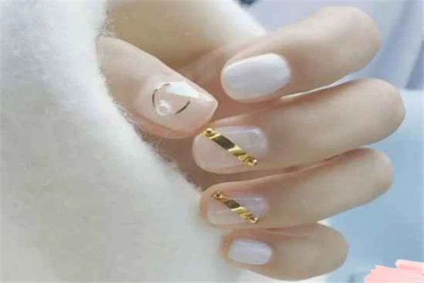 第五款的话很女神了哟~采用的整体是珠光白甲油,配合了金箔纸和金属圈、珍珠等做装饰,超级仙了耶~