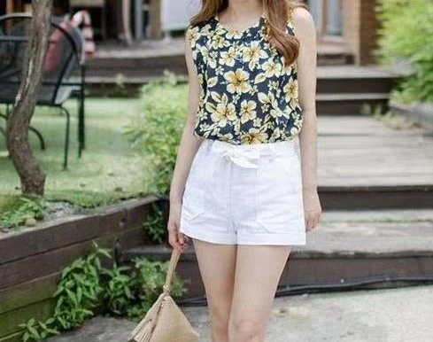 白色短裤配一个格子坎肩衬衣,给人一种青春时尚,靓丽女孩,有一种赏心悦目的感觉。这种搭配很适张扬青春,合活力四射的女孩穿。