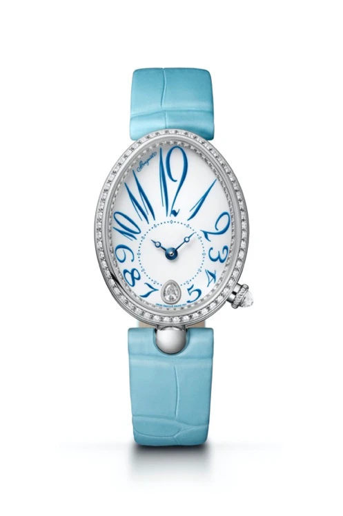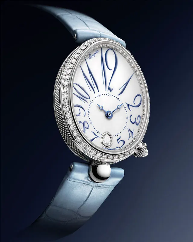 宝玑首次运用纯净无瑕的白色“大明火”珐琅,凸显Reine de Naples那不勒斯王后系列腕表的精美鹅蛋形表盘,搭配蓝天色调数字时标,呈现完满的整体设计。