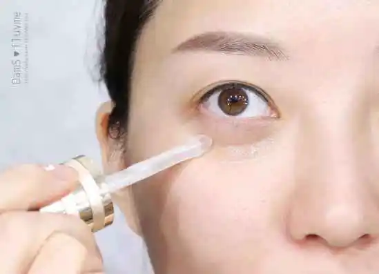 取一滴眼霜于指尖轻柔地由上内眼角至外眼角