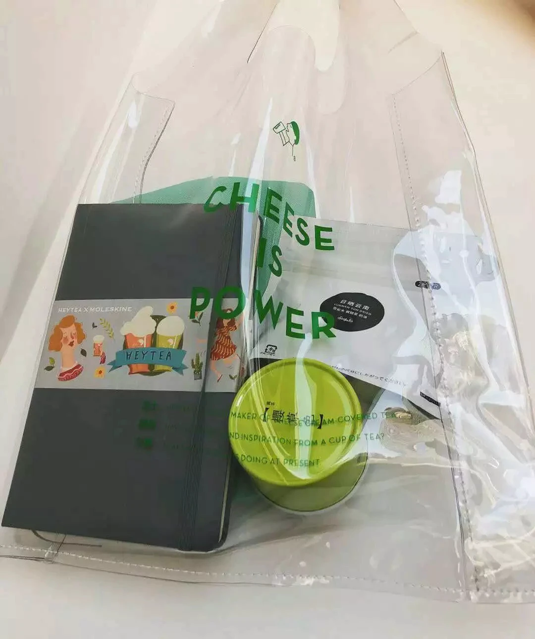 这也不是最时尚的,当不少品牌还在推帆布包时,4月底,喜茶推出一款PVC材质的透明包。