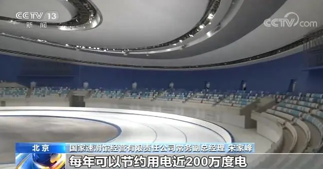 国家速滑馆经营有限责任公司常务副总经理 宋家峰:国家速滑馆是全冰面设计,面积近12000平方米,在这么大的冰面上,我们采用的是绿色环保的二氧化碳跨临界直冷制冰技术,与传统的氟利昂制冷系统比较,我们节能可以达到20%以上,每年可以节约用电近200万度电,相当于北京6000个家庭一个月的用电量。