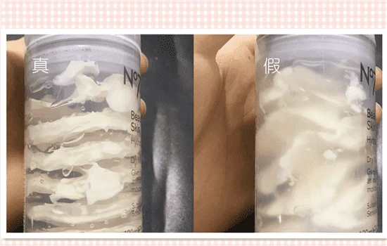 从真假boots冰激凌面膜侧面瓶身的对比来看,正品的boots冰激凌面膜每一处的螺旋都是清晰的,而反观假货,会感觉里面的面膜模糊不清。这是正品与假货制作工艺上的区别缩体现出来的不同。