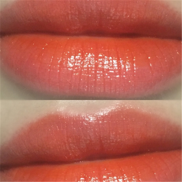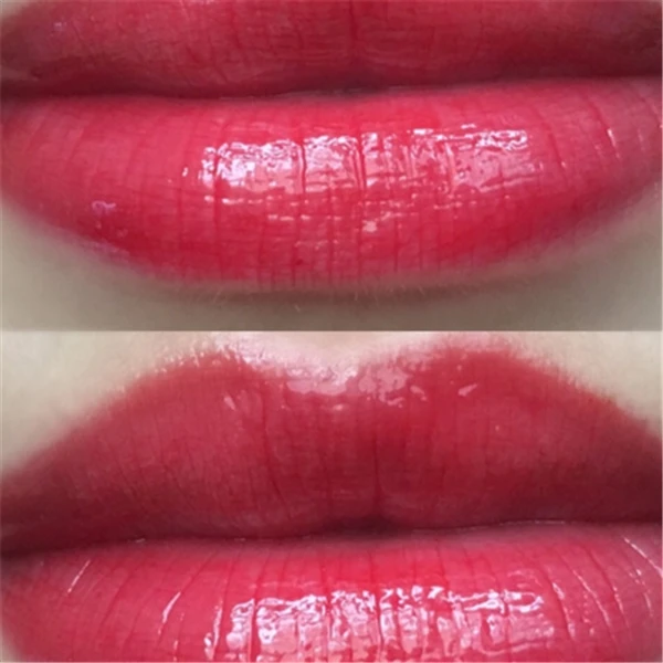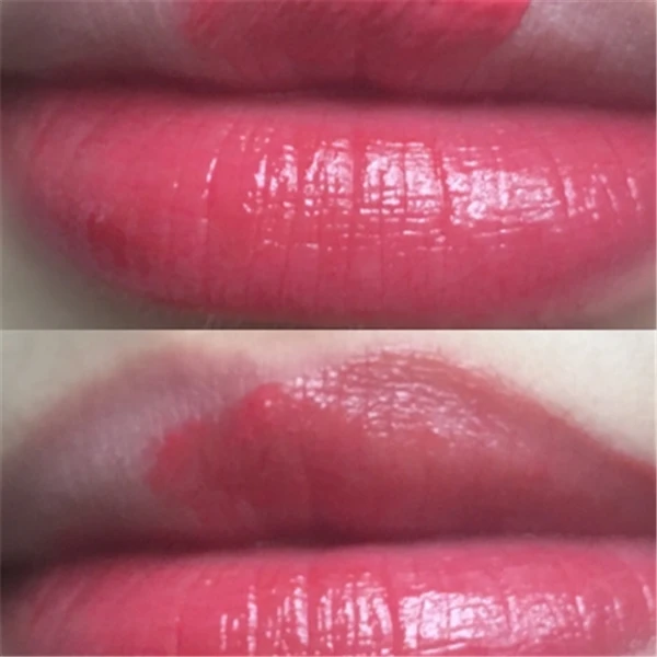 重点:只用一面唇刷涂!首先在唇部内侧厚涂唇釉,上下唇都厚涂,此时唇部边缘是没有唇釉的,再用同一面唇刷,把剩下很少的唇釉平行嘴部在唇部边缘涂抹即可。如果怕粘牙齿,可以用棉花棒垂直,轻轻的含在嘴内,轻轻滚动即可。