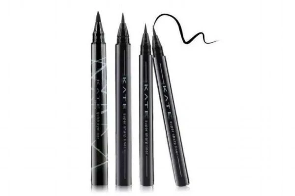 1、Kate 极细眼线液笔Kate极细眼线液笔的防水防油能力非常强,不过笔芯稍硬,笔头是平面圆的,所以一开始可以先在手背上将笔芯摩尖,最后上色效果也十分自然,不晕染,容易上手。