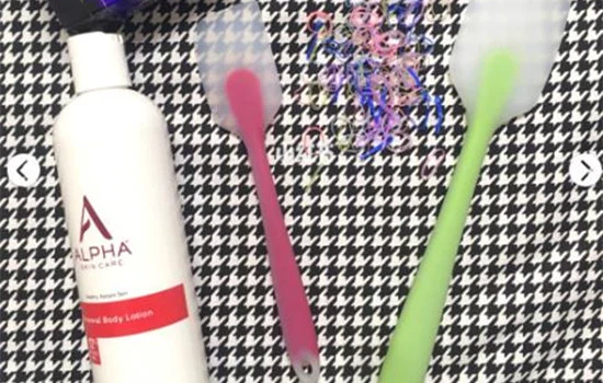 2、将身体乳倒在化妆棉,就可以使用了。刮刀可随意转动轻拍背部,达到涂抹身体乳的效果。