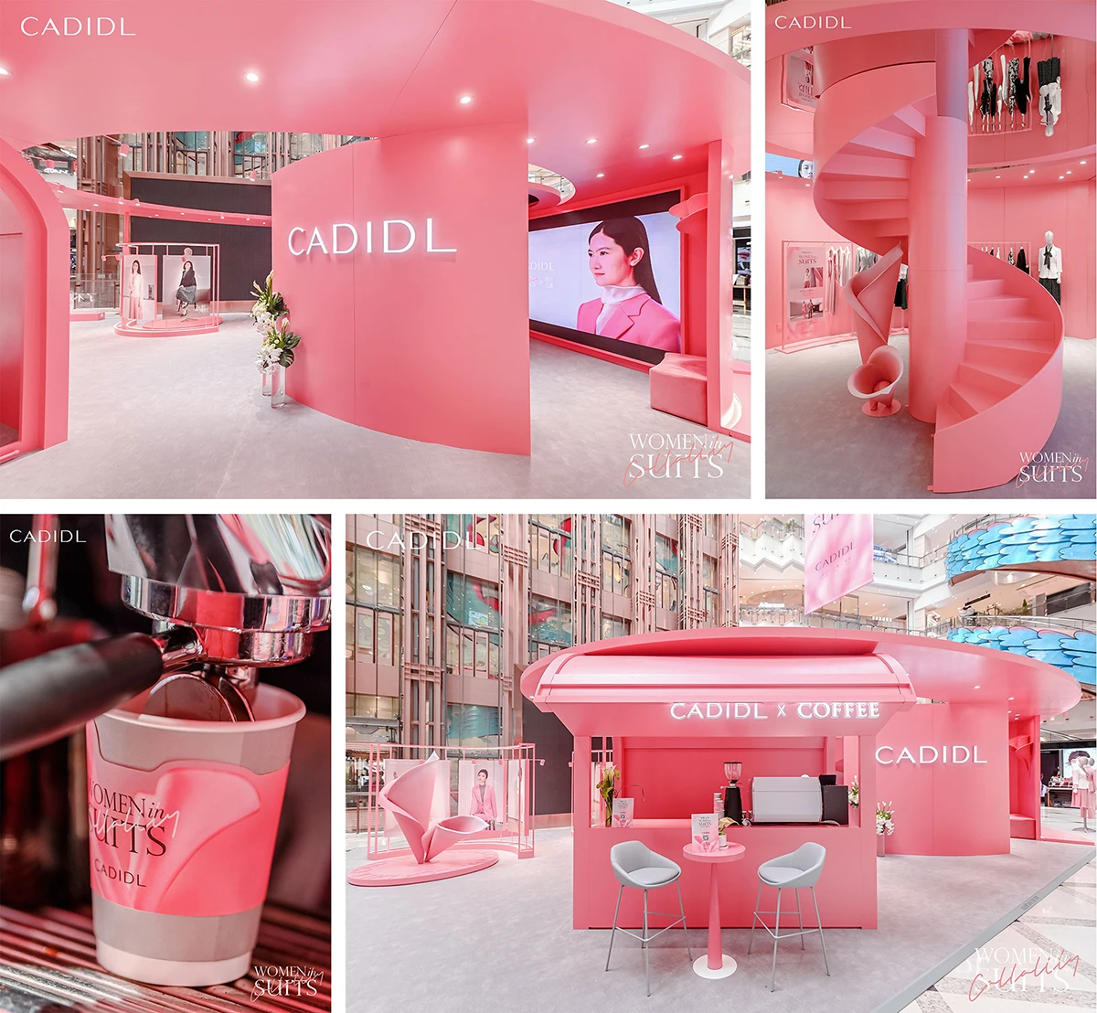 CADIDL(卡迪黛尔)「WomenInSuits」智雅套装节限时展览将品牌色卡迪灰与初见粉巧妙融合,展区中央的旋转楼梯更是打造了独特亮眼的视觉效果。展区分为「智雅她魅力」-女性肖像展览区、「智雅DNA」-品牌故事展示打卡区、「智雅CAFE」-咖啡休闲互动区以及「智雅经典」套装展示区,为整体空间增添了高级优雅的氛围感,也将品牌二十多年来的精神与内涵向大众娓娓道来。