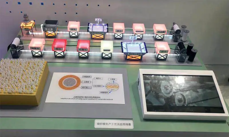 在展览会上,公司重点展出碳纤维生产工艺及应用场景沙盘模型,动态模拟碳纤维生产从原材料到成品丝束加工工艺及生产工序,重点突出碳纤维助剂相关的上油和上浆工序及企业产品应用后的作用和效果。