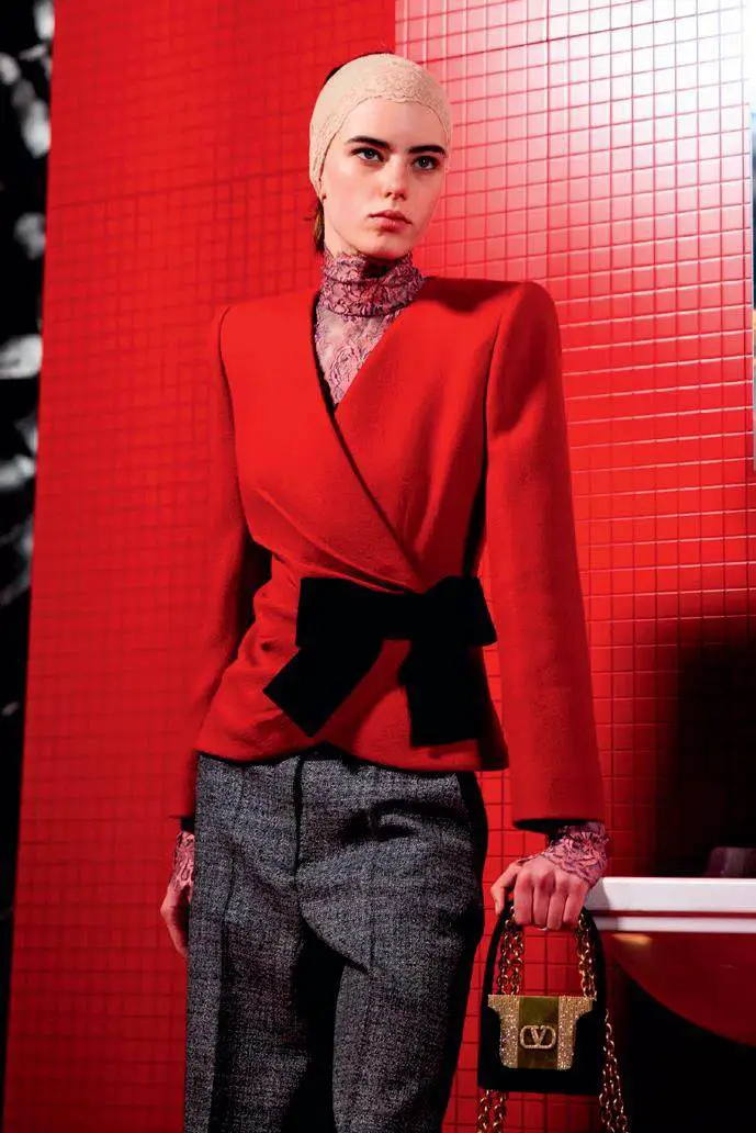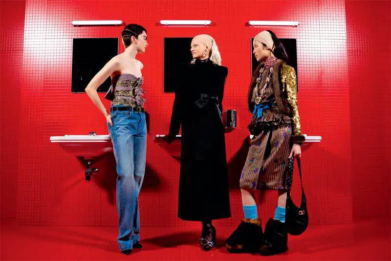 首先,是秀场空间设计的戏剧化呈现。品牌现在往往将场地精心布置成一个极具舞台感的空间,灯光、布景和座位安排都经过周密考虑,去营造出叙事仪式感。以Ferragamo在2023年米兰时装周发布的秋冬系列为例,创意总监MaximilianDavis延续了其标志性的极简主义美学,将秀场打造成一个被明亮单一色彩所包裹的沉浸式空间。强烈的单色背景不仅突出了服装的色彩和廓形,更营造出一种肃穆而富有张力的舞台效果。在Valentino 2025秋冬系列发布中,创意总监Alessandro Michele摒弃了品牌过往优雅庄重的传统印象,将秀场布置成一个公共卫生间,这个反传统的空间选择本身就极具戏剧性:模特们在这样一个充满日常却又被红光笼罩的“公共浴室”中穿梭,赋予了整个空间一种暧昧而强烈的视觉冲击,也为本季Valentino注入了全新的戏剧张力与话题性。