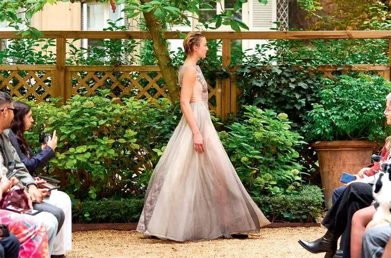 另外,秀场布置中也常常蕴含着丰富的文化符号和品牌象征,这些元素往往与服装系列主题紧密相连,通过视觉语言去传递深层信息。比如在Ferragamo2025秋冬系列中,创意总监MaximilianDavis用秀场空间的设计致敬德国编舞大师Pina Bausch。铺满花瓣的伸展台,是呼应Bausch的作品《康乃馨》,也暗示着本季服装的情感张力与肢体表达;秀末两件饰有康乃馨般流苏的网纱洋装,以及宽松剪裁的外套与透视洋装,均呼应了Bausch的艺术风格与个人穿着。这种布置不仅是致敬,更是引导观众理解服装系列背后的艺术灵感与情感内涵。